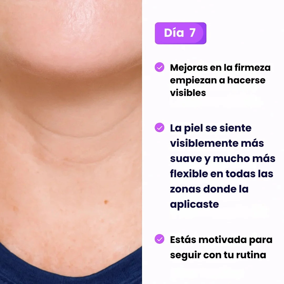La flacidez y las líneas profundas en el cuello pueden hacerte sentir insegura. Esta crema actúa rápidamente para reafirmar y suavizar la piel, devolviendo la confianza en tu apariencia.