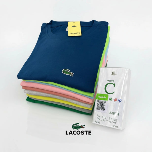 Incluye 5 camisetas Lacoste (algodón licrado) y 1 loción Lacoste de 60 ml. Todo llega en un solo paquete.